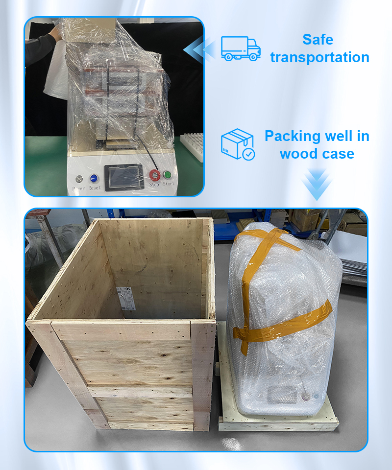 It also highlights the final step—placing the machine in a wooden case for shipping. The second photo shows the custom crate next to the machine, which is already wrapped and secured, providing added impact protection and reliable stability for long-distance delivery.